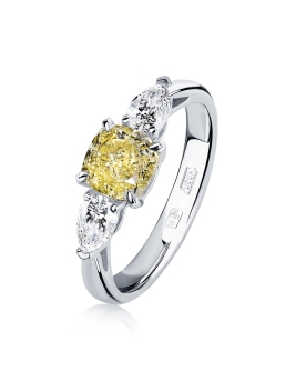 Классическое кольцо из платины выглядит оригинально благодаря необычному дизайну. Два драгоценных камня окружают центральный бриллиант, становясь центром композиции и радуя взгляд своим сиянием.